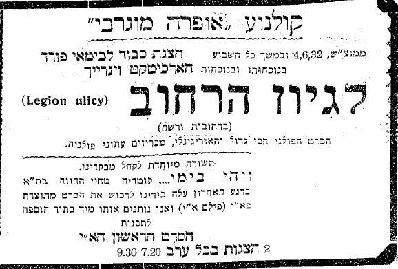 [5] אלכסנדר פורד (1908-1980) – יהודי, במאי סרטים חשוב בפולין; סרטו "לגיון הרחוב", Legion Ulici, פולין, 1932, הפקה: "ליאו-פילם", עוסק בבעיות נוער.